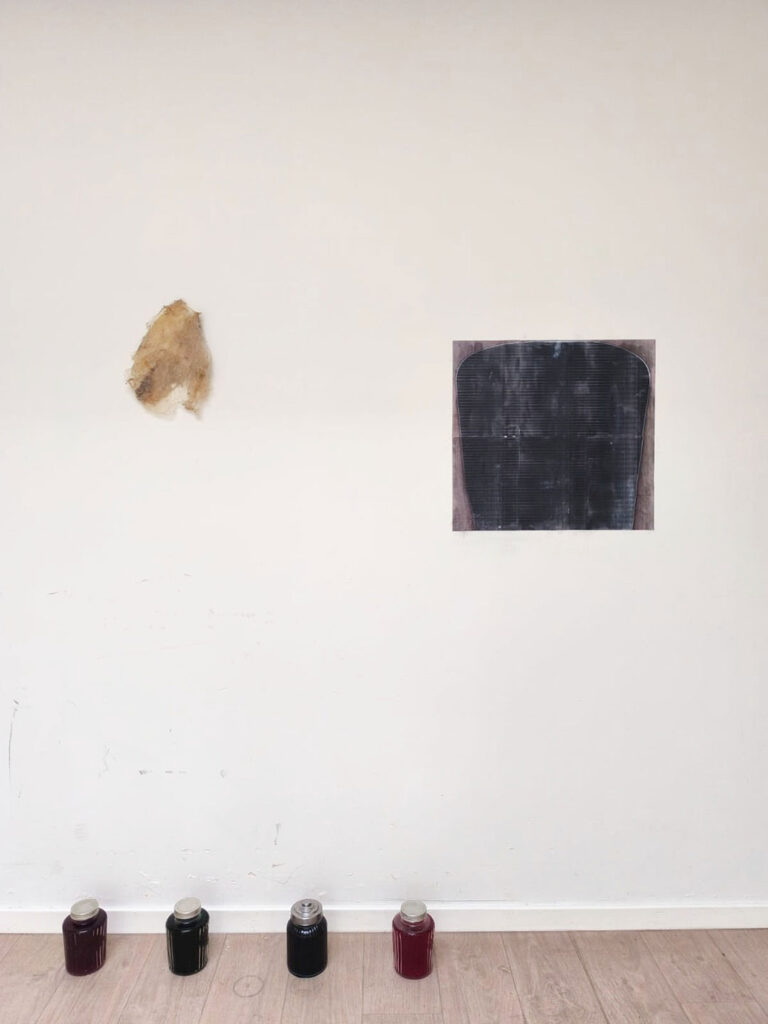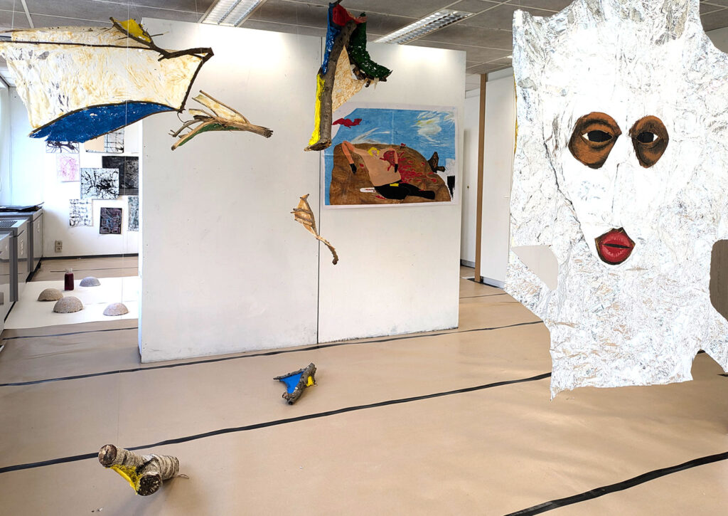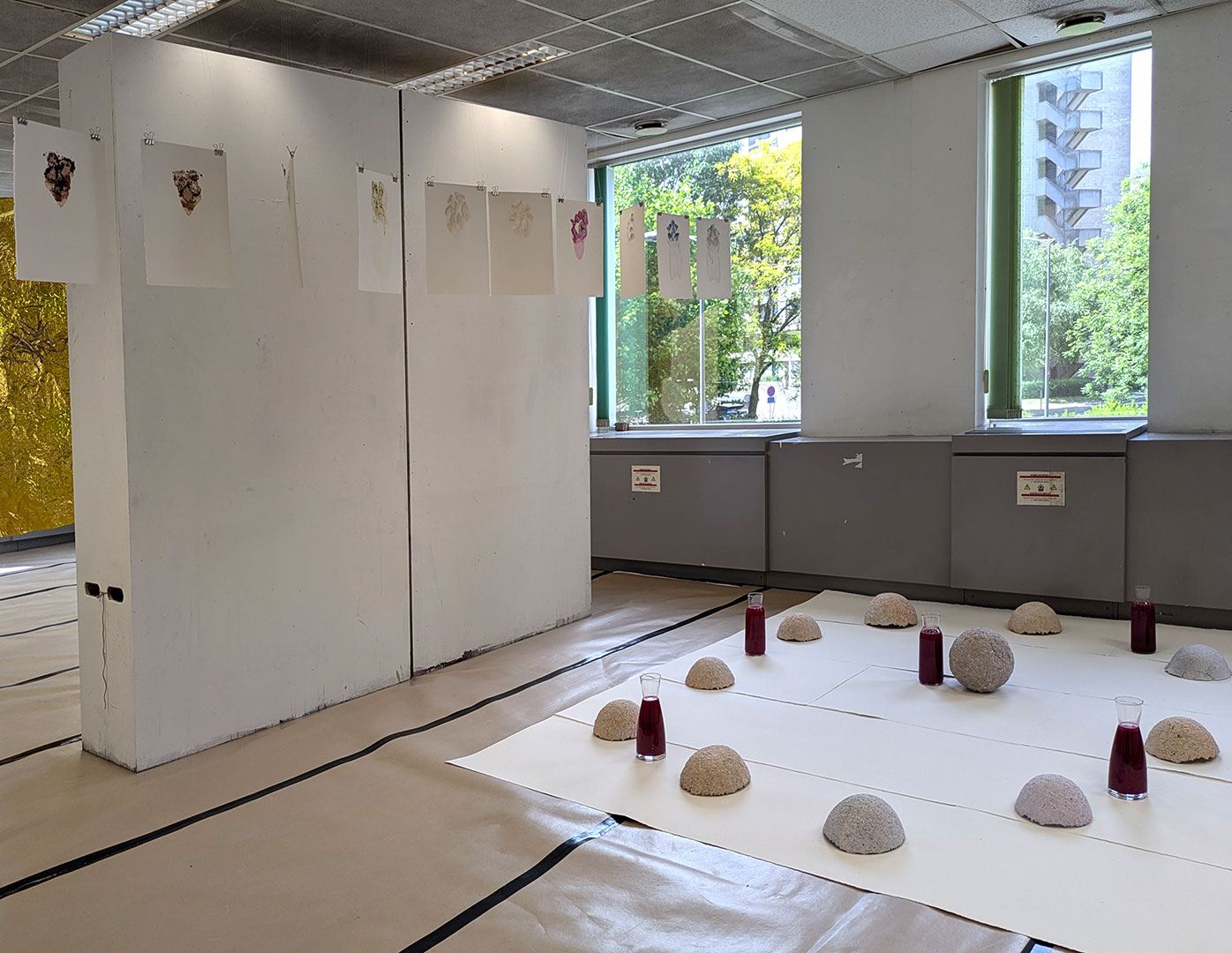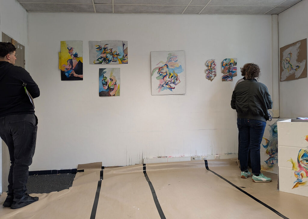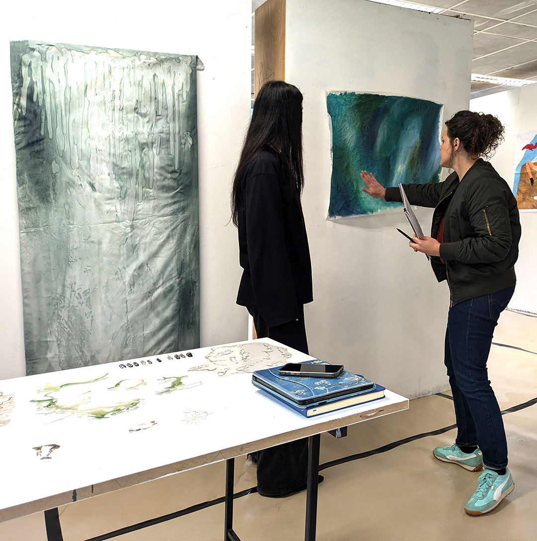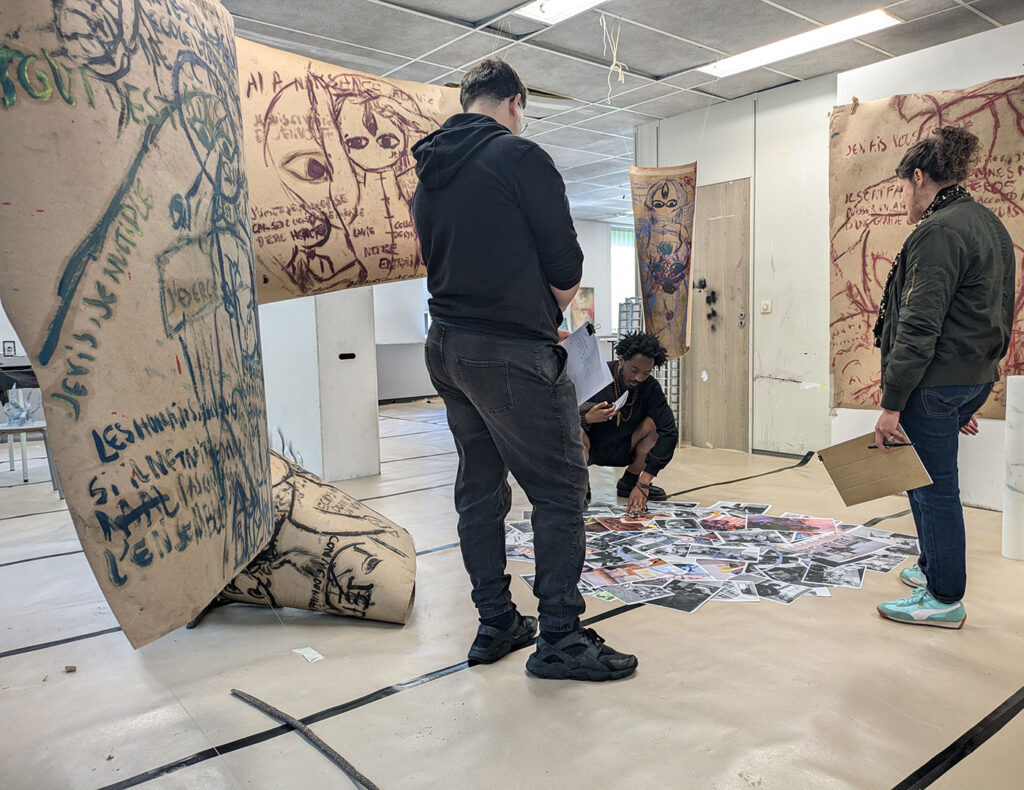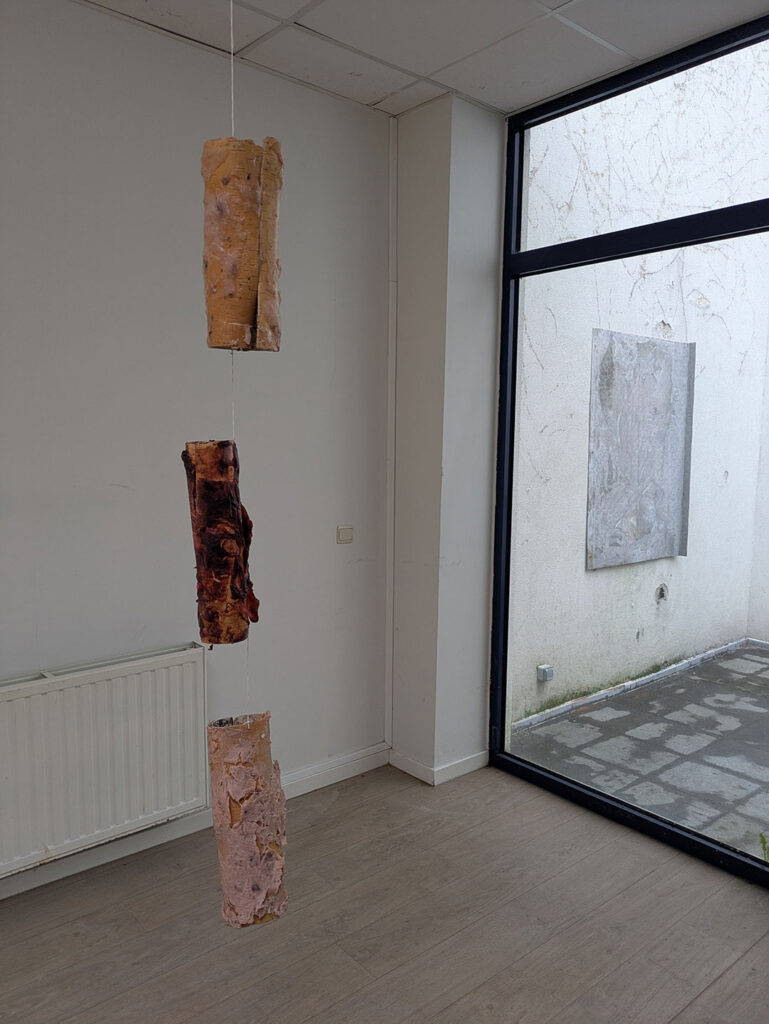La thématique de la peau, de la nouvelle peau, de la membrane, a été proposée au groupe des B3 peinture afin d’orienter leur travail de manière libre et expérimentale. Le workshop s’est articulé en deux temps : un premier moment de création et d’échanges autour de leurs projets, puis un second consacré à la mise en espace des réalisations. Le lieu a naturellement infusé et inspiré leurs productions, tant dans les dispositifs d’accrochage que dans la scénographie. Chacun·e a formulé une proposition originale et a pu découvrir de nouvelles techniques de manière expérimentale. Le savon, les biomatériaux ou encore l’électrolyse font partie des procédés que certain·es ont explorés.Malgré la diversité des propositions, une cohérence s’est dégagée grâce à la thématique commune et à la scénographie pensée collégialement.
