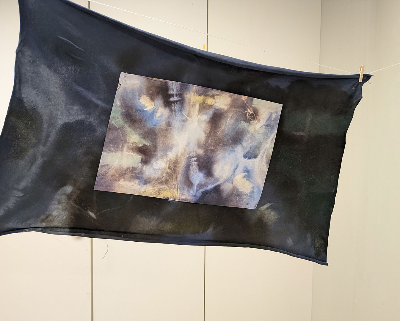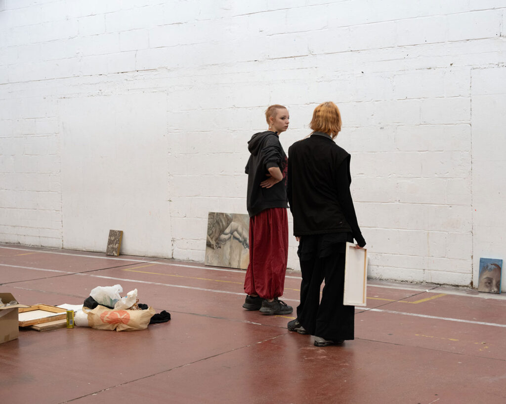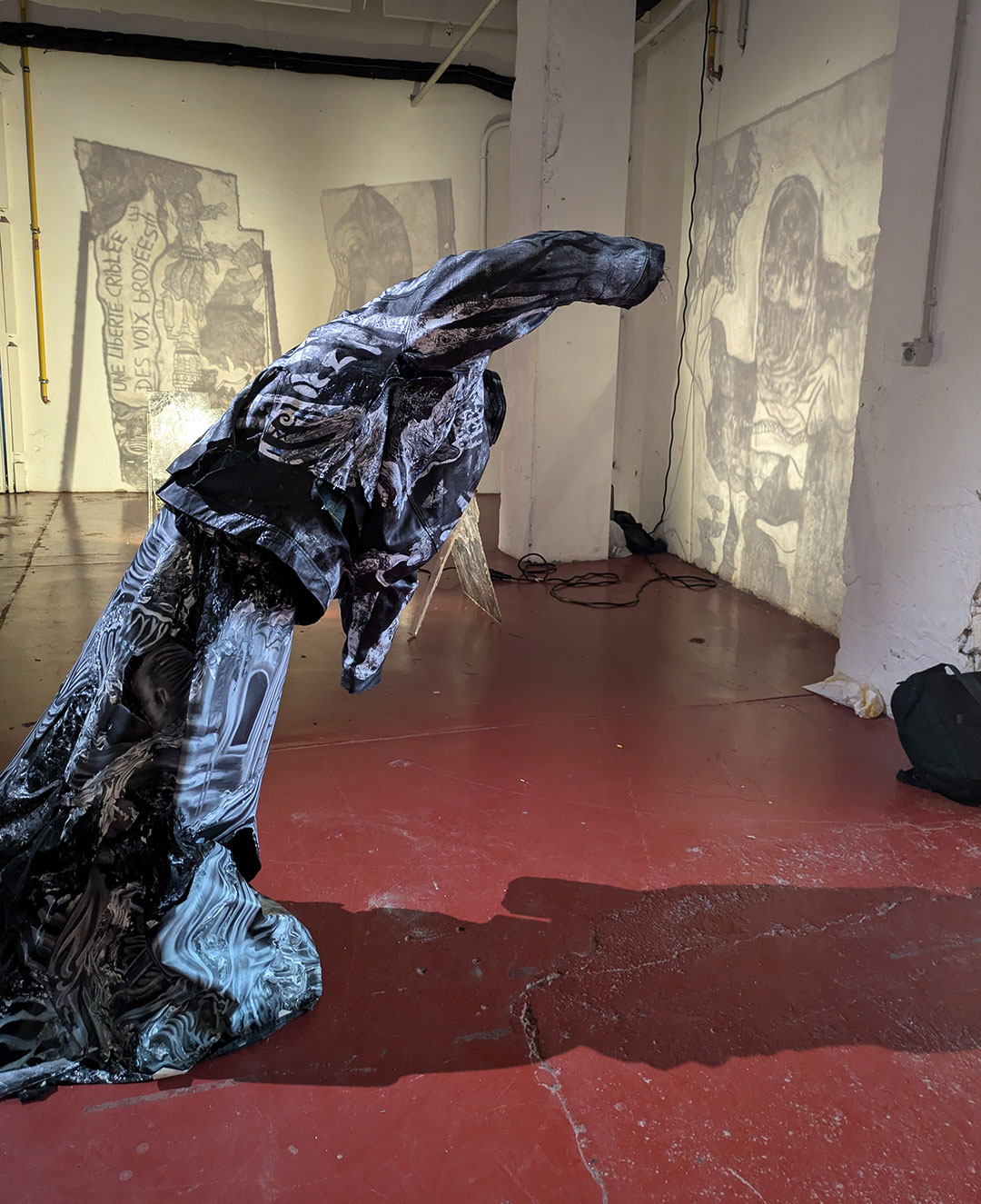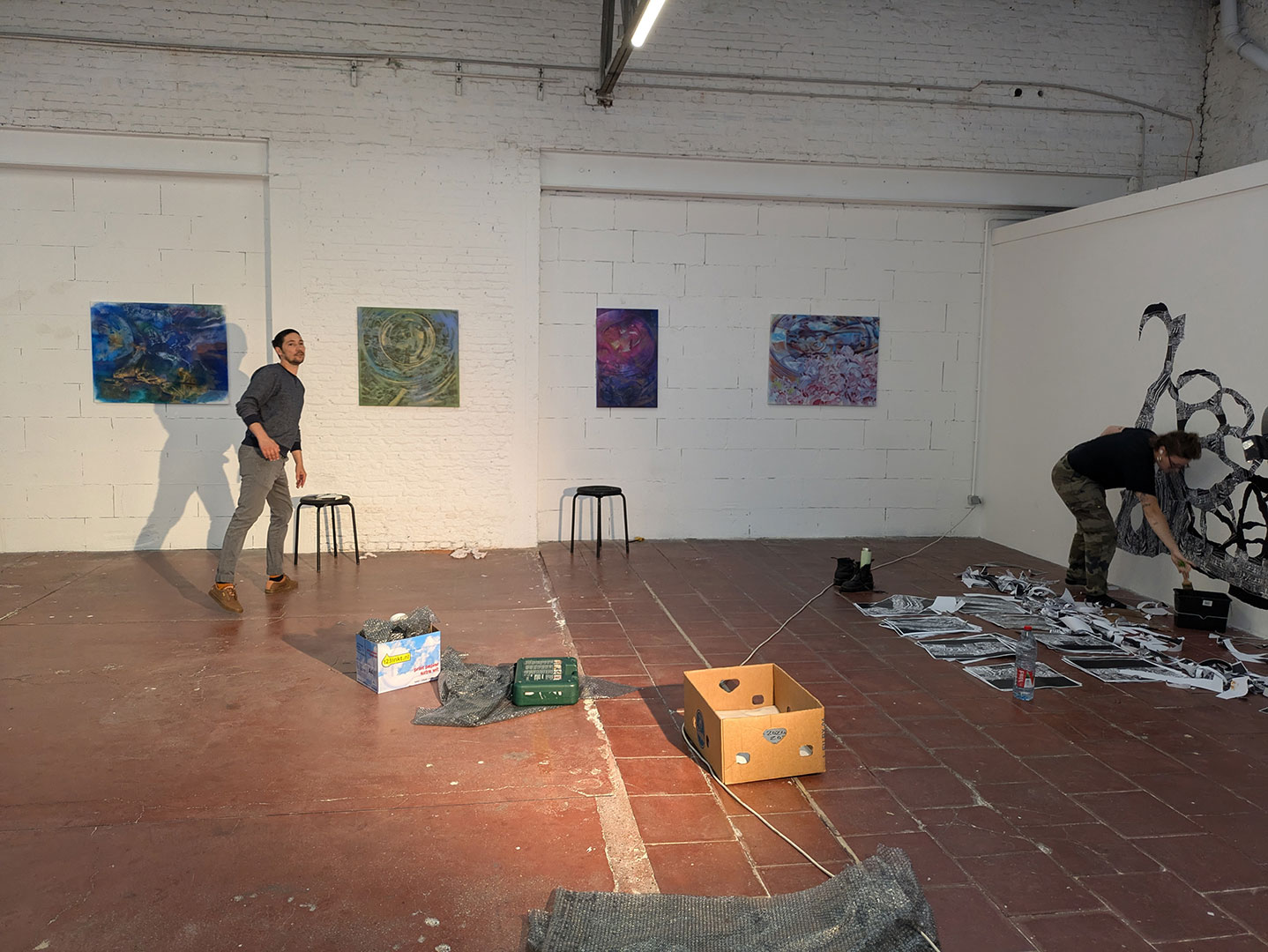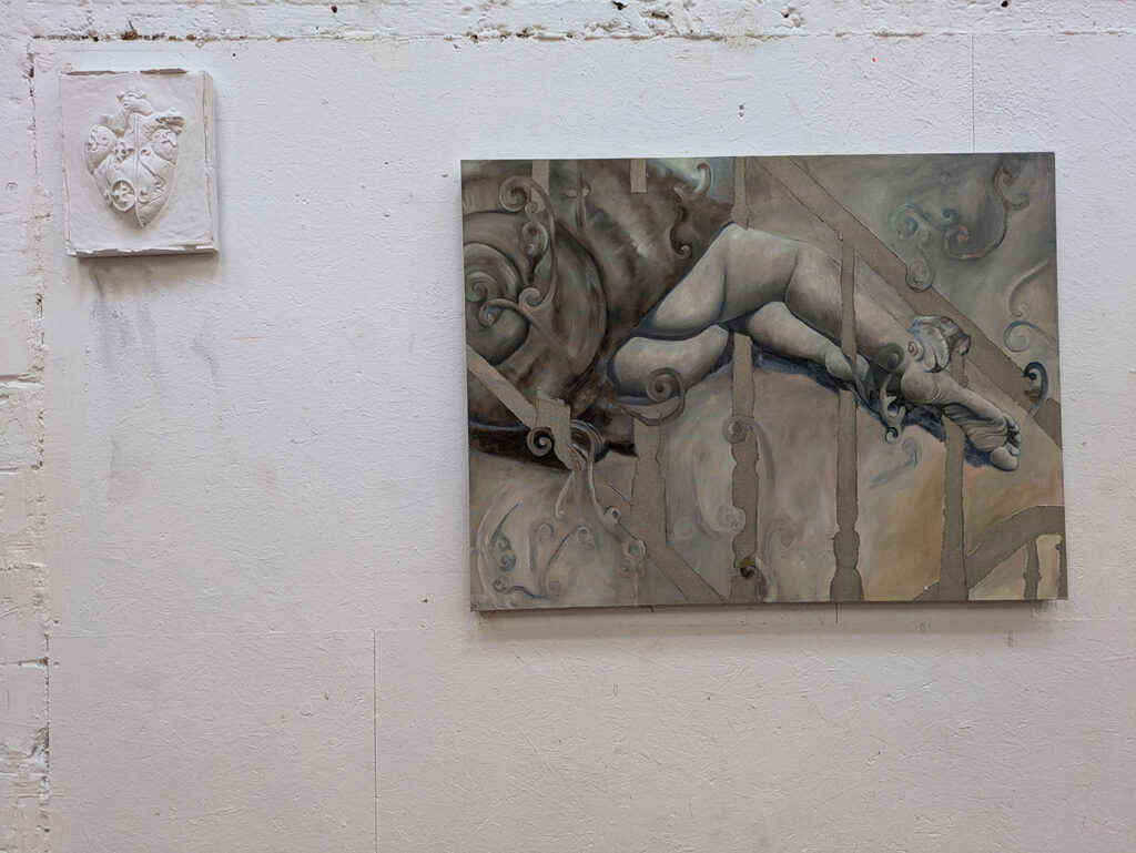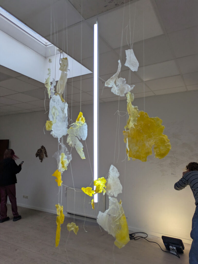 La thématique de la peau, de la nouvelle peau, de la membrane, a été proposée au groupe des B3 peinture afin d’orienter leur travail de manière libre et expérimentale. Le workshop s’est articulé en deux temps : un premier moment de création et d’échanges autour de leurs projets, puis un second consacré à la mise en espace des réalisations. Le lieu a naturellement infusé et inspiré leurs productions, tant dans les dispositifs d’accrochage que dans la scénographie. Chacun·e a formulé une proposition originale et a pu découvrir de nouvelles techniques de manière expérimentale. Le savon, les biomatériaux ou encore l’électrolyse font partie des procédés que certain·es ont explorés.Malgré la diversité des propositions, une cohérence s’est dégagée grâce à la thématique commune et à la scénographie pensée collégialement.