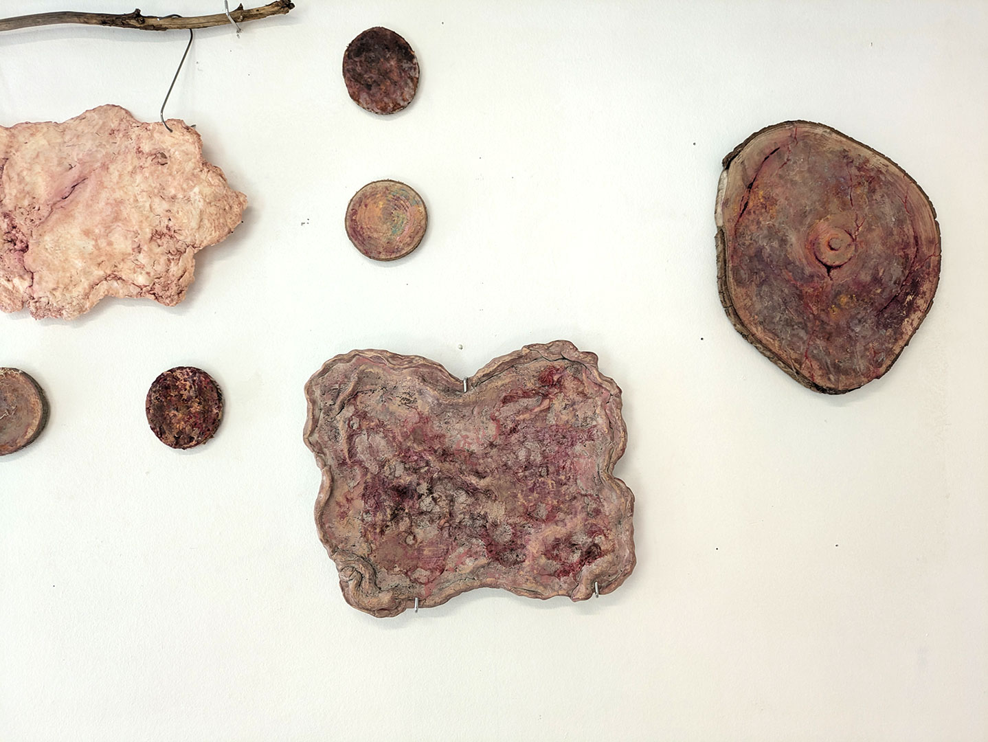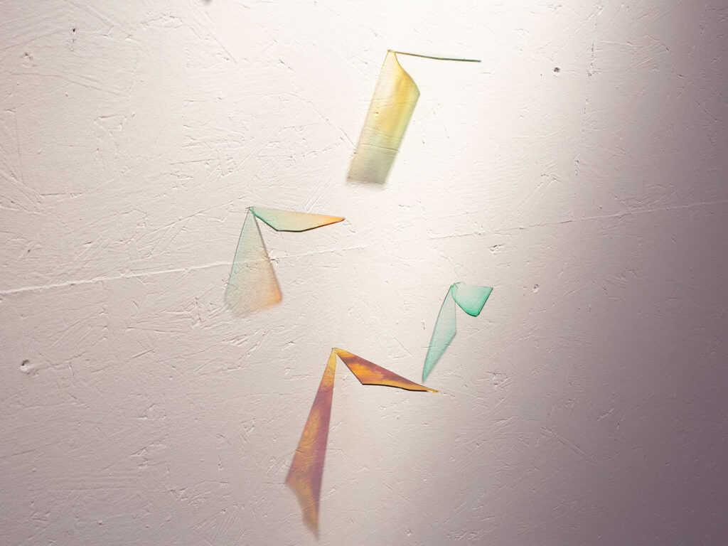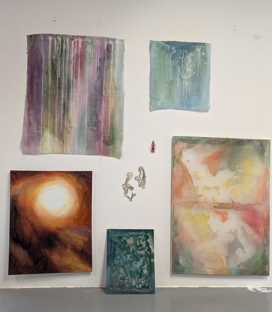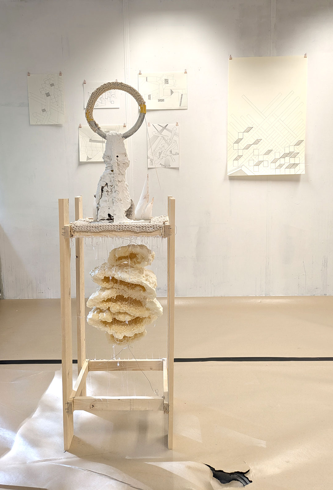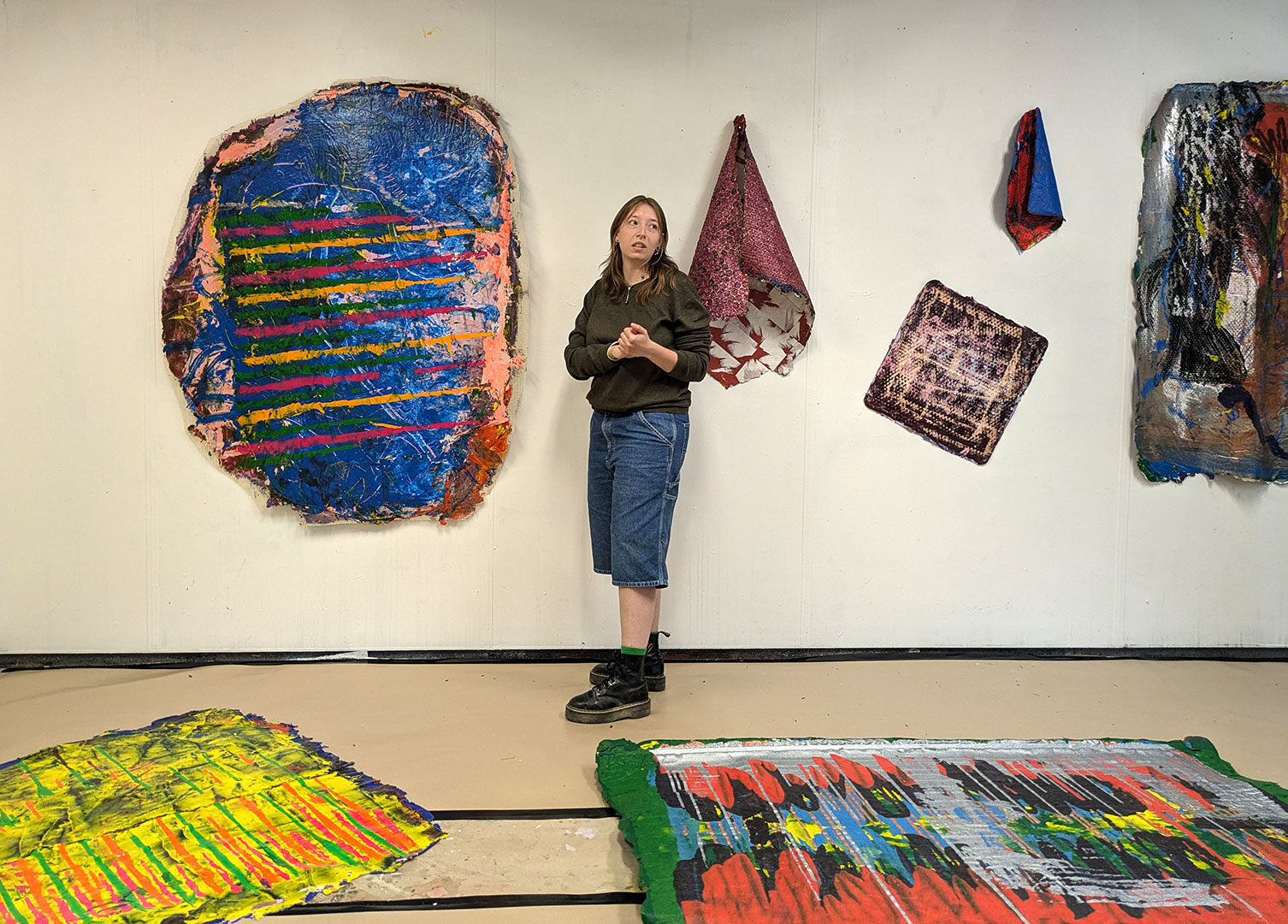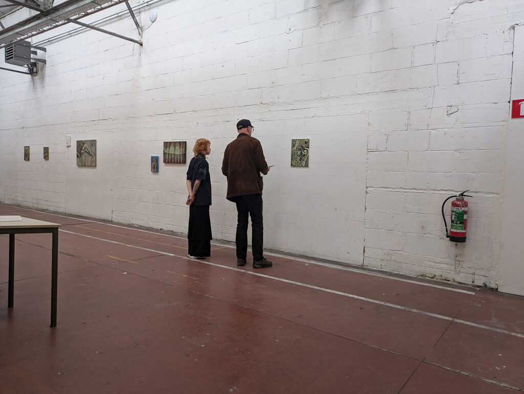 La thématique de la peau, de la nouvelle peau, de la membrane, a été proposée au groupe des B3 peinture afin d’orienter leur travail de manière libre et expérimentale. Le workshop s’est articulé en deux temps : un premier moment de création et d’échanges autour de leurs projets, puis un second consacré à la mise en espace des réalisations. Le lieu a naturellement infusé et inspiré leurs productions, tant dans les dispositifs d’accrochage que dans la scénographie. Chacun·e a formulé une proposition originale et a pu découvrir de nouvelles techniques de manière expérimentale. Le savon, les biomatériaux ou encore l’électrolyse font partie des procédés que certain·es ont explorés.Malgré la diversité des propositions, une cohérence s’est dégagée grâce à la thématique commune et à la scénographie pensée collégialement.