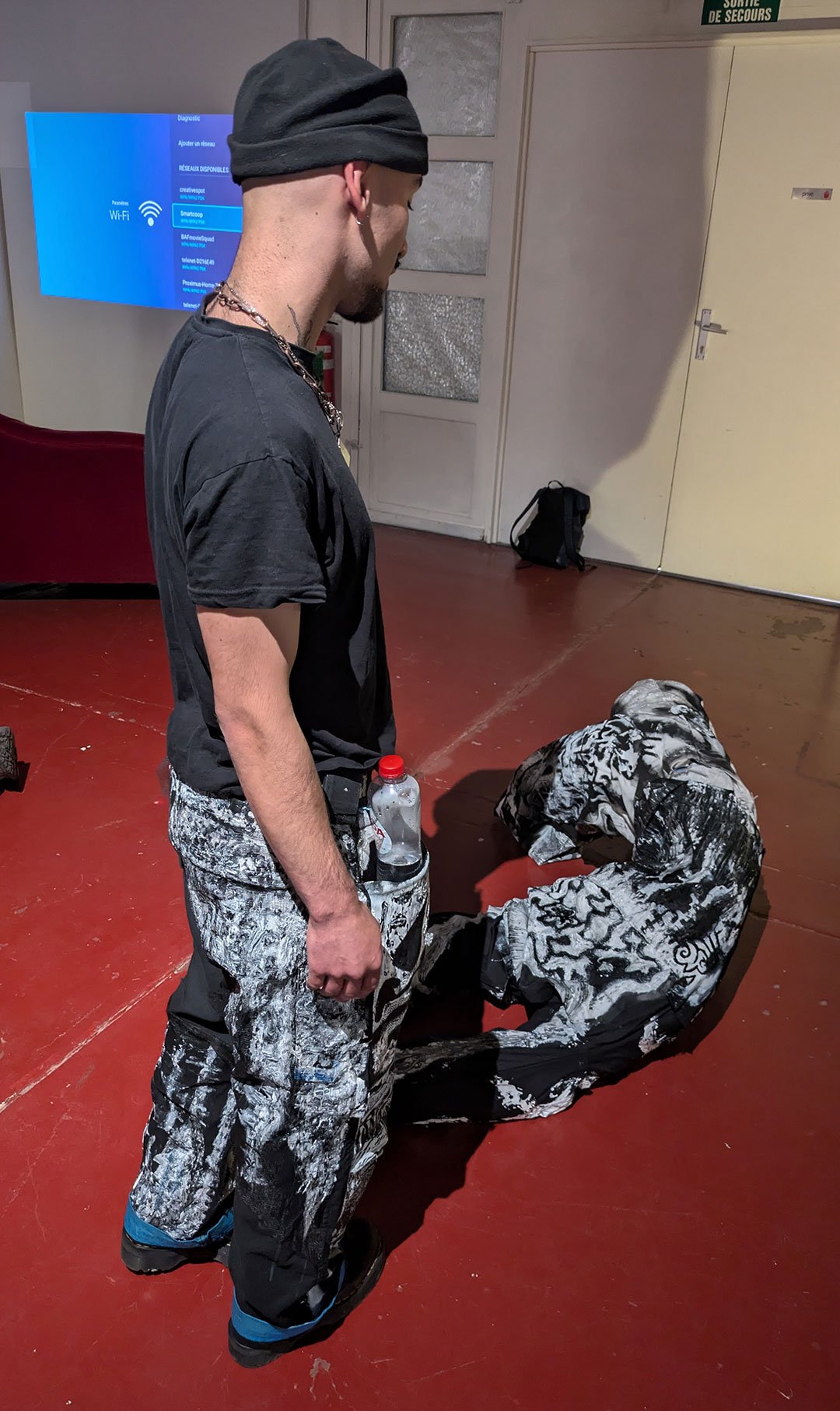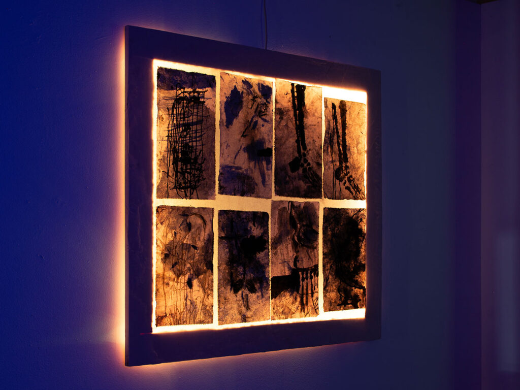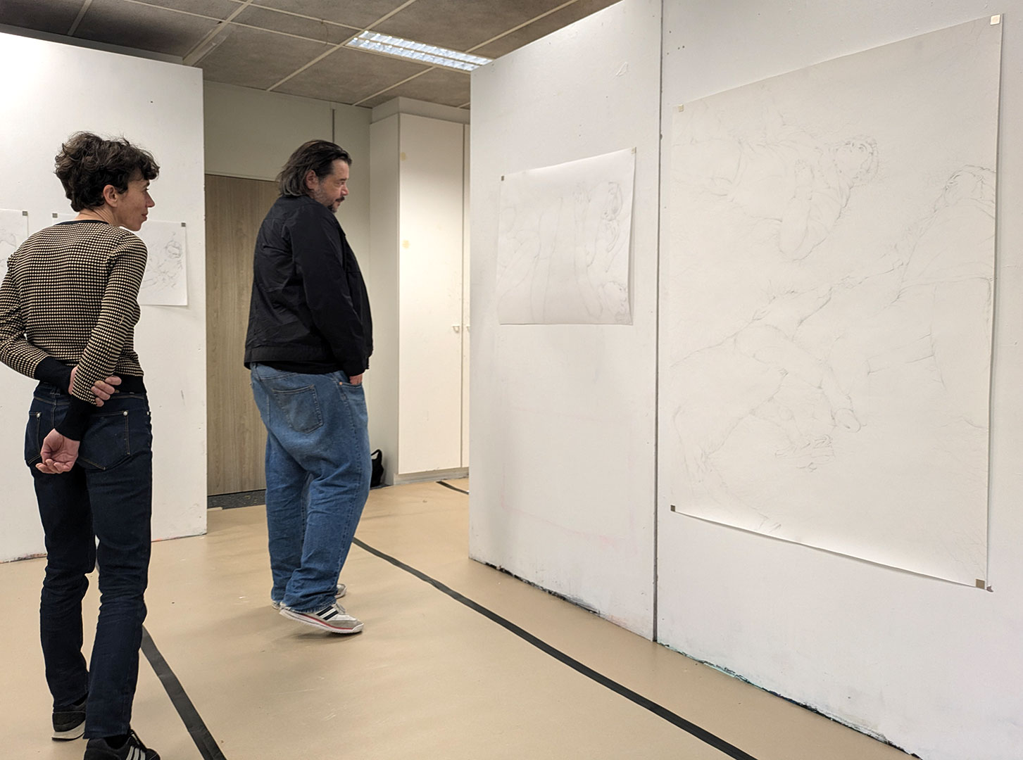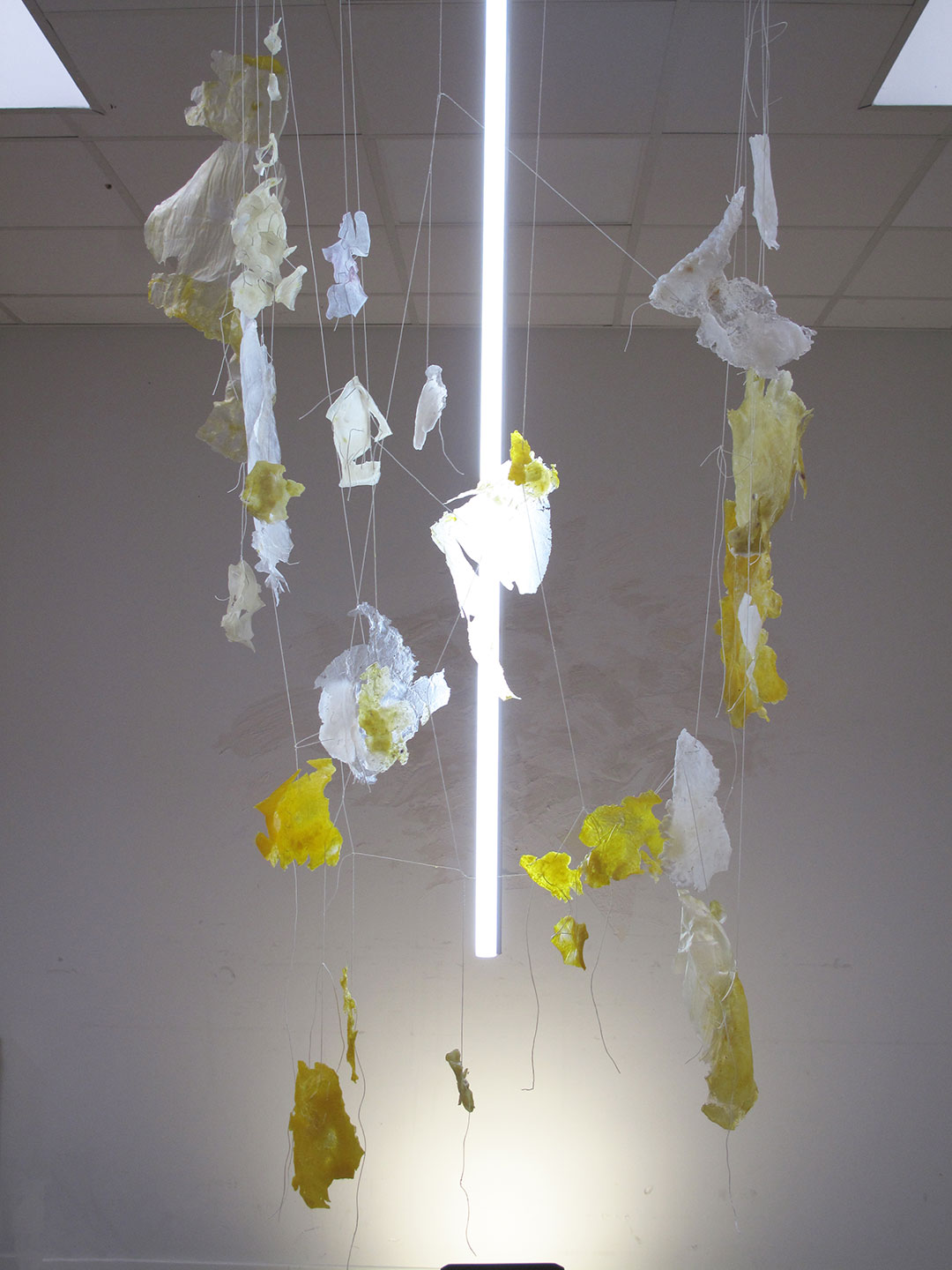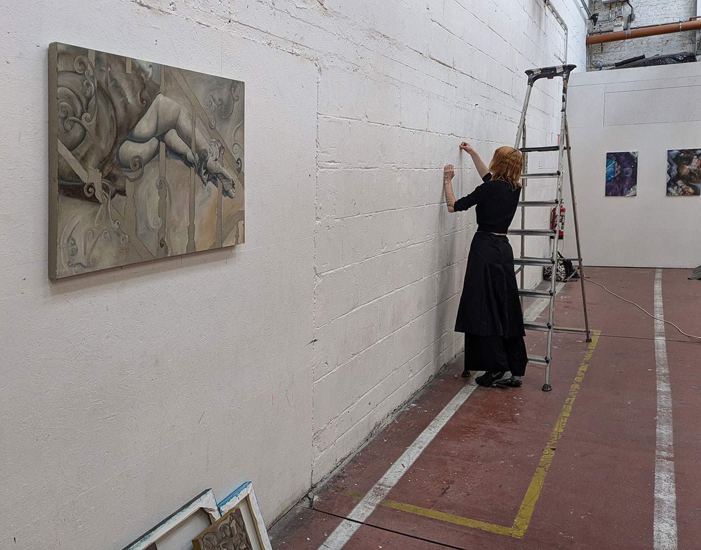 La thématique de la peau, de la nouvelle peau, de la membrane, a été proposée au groupe des B3 peinture afin d’orienter leur travail de manière libre et expérimentale. Le workshop s’est articulé en deux temps : un premier moment de création et d’échanges autour de leurs projets, puis un second consacré à la mise en espace des réalisations. Le lieu a naturellement infusé et inspiré leurs productions, tant dans les dispositifs d’accrochage que dans la scénographie. Chacun·e a formulé une proposition originale et a pu découvrir de nouvelles techniques de manière expérimentale. Le savon, les biomatériaux ou encore l’électrolyse font partie des procédés que certain·es ont explorés.Malgré la diversité des propositions, une cohérence s’est dégagée grâce à la thématique commune et à la scénographie pensée collégialement.