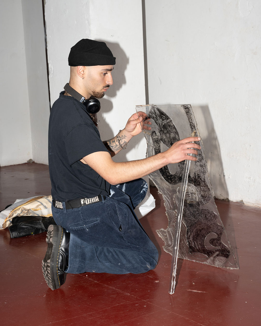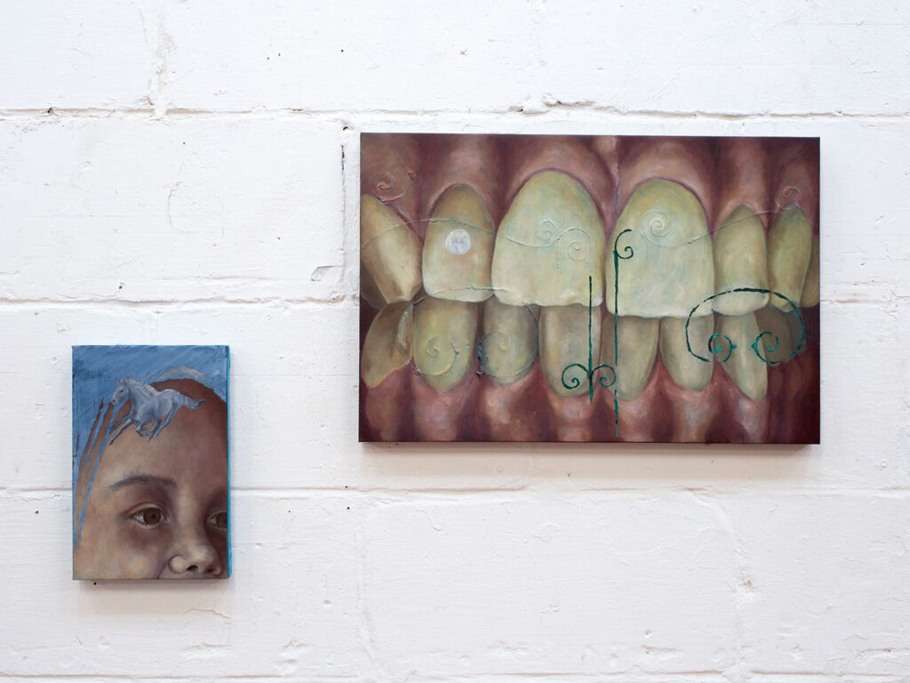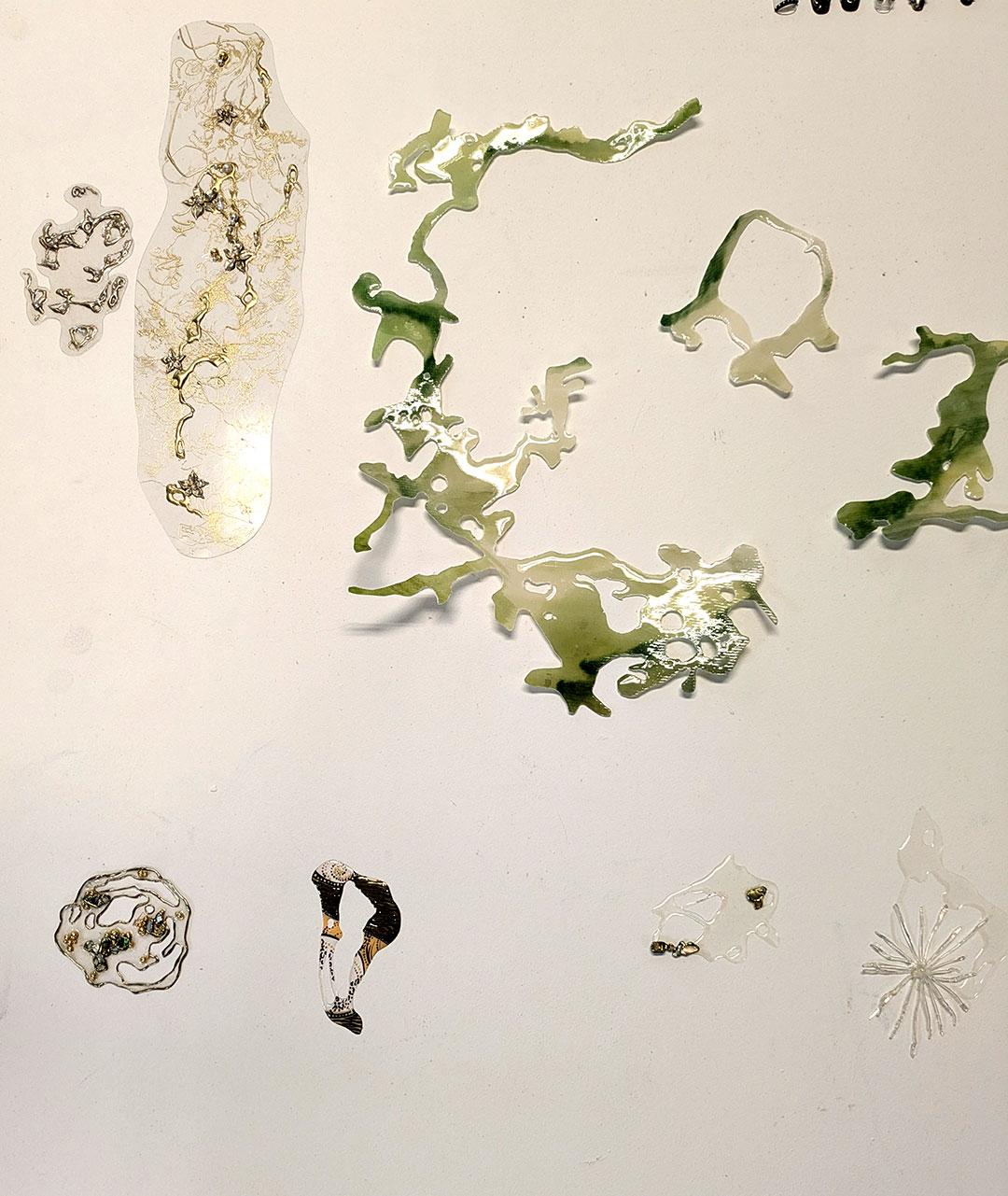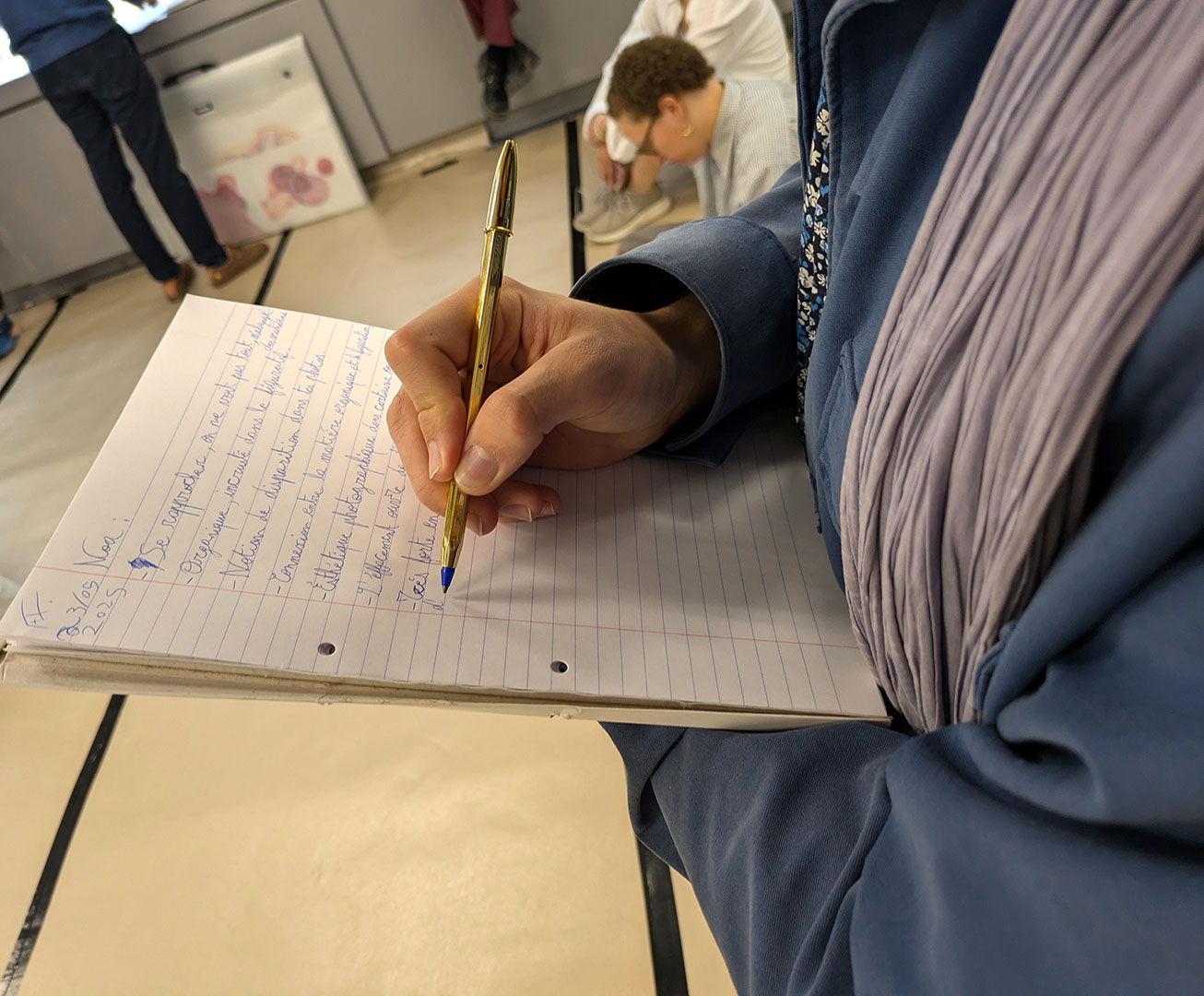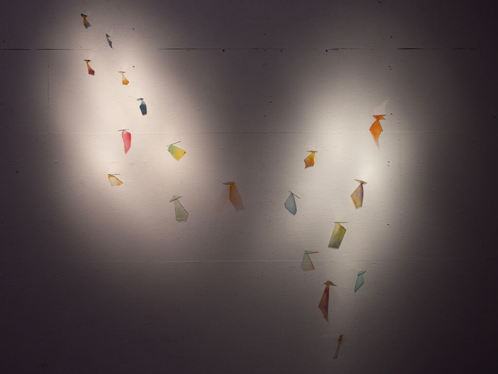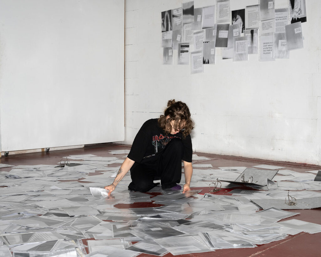 La thématique de la peau, de la nouvelle peau, de la membrane, a été proposée au groupe des B3 peinture afin d’orienter leur travail de manière libre et expérimentale. Le workshop s’est articulé en deux temps : un premier moment de création et d’échanges autour de leurs projets, puis un second consacré à la mise en espace des réalisations. Le lieu a naturellement infusé et inspiré leurs productions, tant dans les dispositifs d’accrochage que dans la scénographie. Chacun·e a formulé une proposition originale et a pu découvrir de nouvelles techniques de manière expérimentale. Le savon, les biomatériaux ou encore l’électrolyse font partie des procédés que certain·es ont explorés.Malgré la diversité des propositions, une cohérence s’est dégagée grâce à la thématique commune et à la scénographie pensée collégialement.